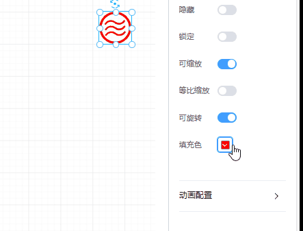我们直接导入svg文件的时候,创建出来的图形库所有节点的属性都是统一设置的,比如说示例demo,我改了fill填充色,不管是圆形还是三条线的填充色都会同时变化,如下图