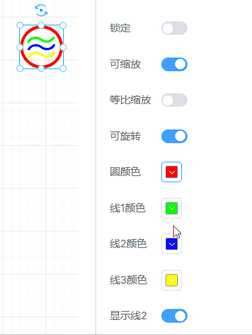 </script>然后我们会发现左侧图形库已经有了我们刚刚导入的自定义svg组件,我们不仅可以控制圆和三条线的颜色,甚至可以控制第二条线是否显示,这在封装类似于开关这种图库的时候非常有用