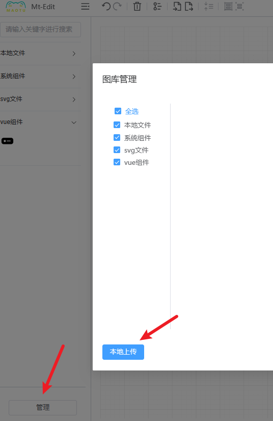 点击左侧图形库下方的管理按钮,会弹出图库管理的弹窗,点击上传即可
